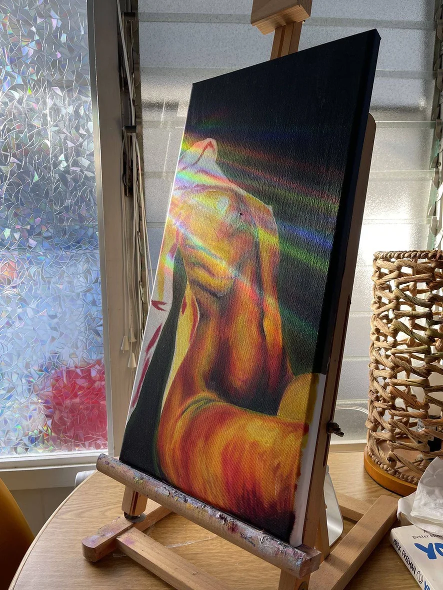 • While he paints (1–1.5 hours), I move slowly, pose, turn, arch — making the paint come alive from every angle